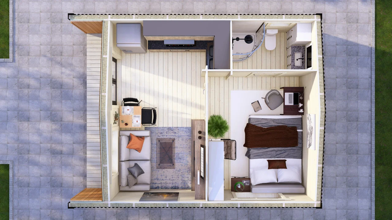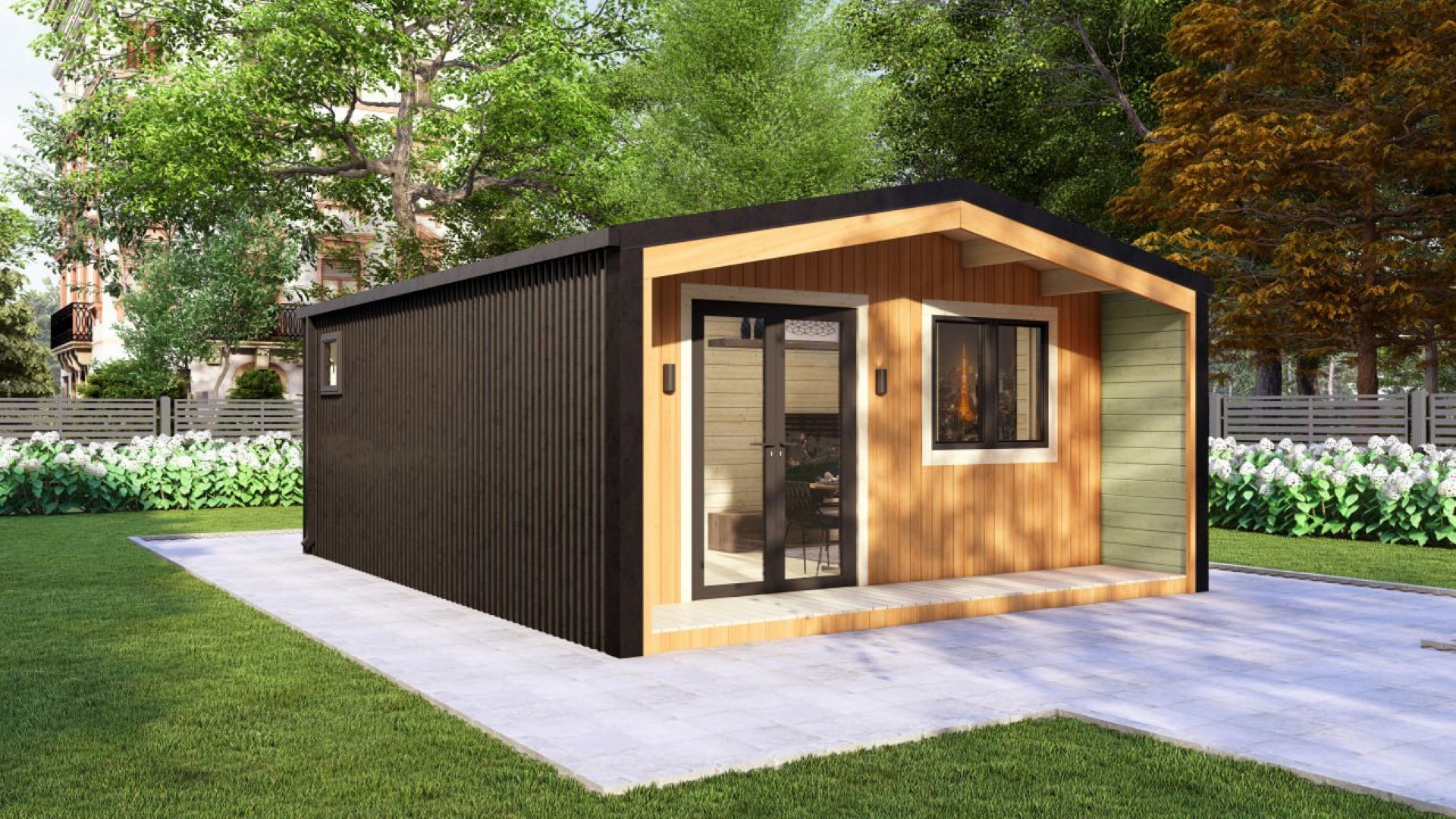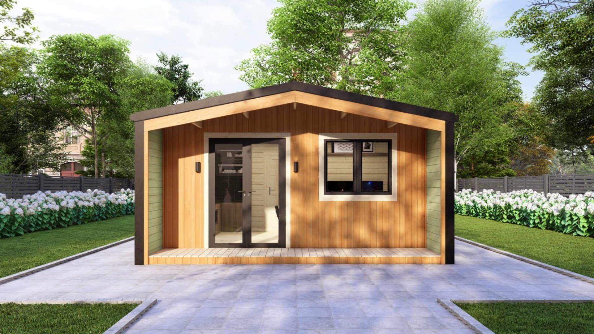 The Barn Style One Bed A2 log cabin is expertly designed for small-space living. Measuring 5m x 6.9m, it offers a well-planned internal layout without compromising on space. This cabin is similar to our One Bed A style but features an entrance on the left side, creating a narrower front-facing. If this door position doesn’t suit your needs, you can opt for the One Bed A style cabin.