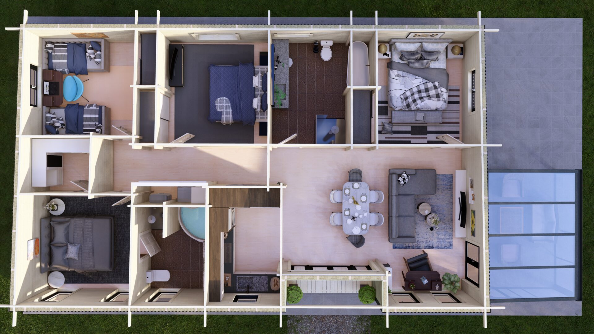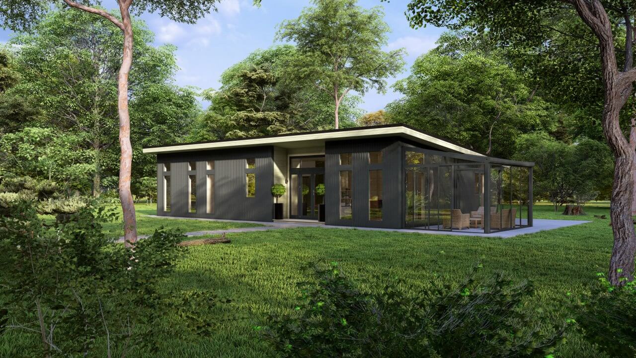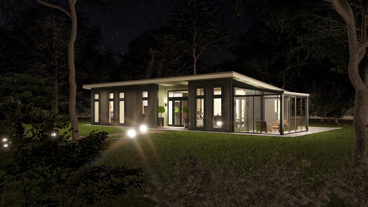 Measuring 14m x 8.5m this model accommodates 4 double bedrooms – The Master bedroom has an ensuite bathroom. The spacious kitchen/living room/dining room area has an incredible vista with full length glass doors and windows optimising light & views. A family bathroom and clever walk in storage closets are sure to suit all your family’s needs.