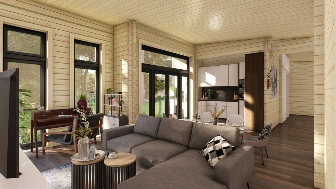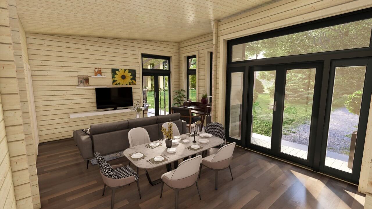 An optional glass veranda (3m x 3m) on the gable end, gives exuberance and a high-quality finish to this superior Barn Style Log Cabin Home.