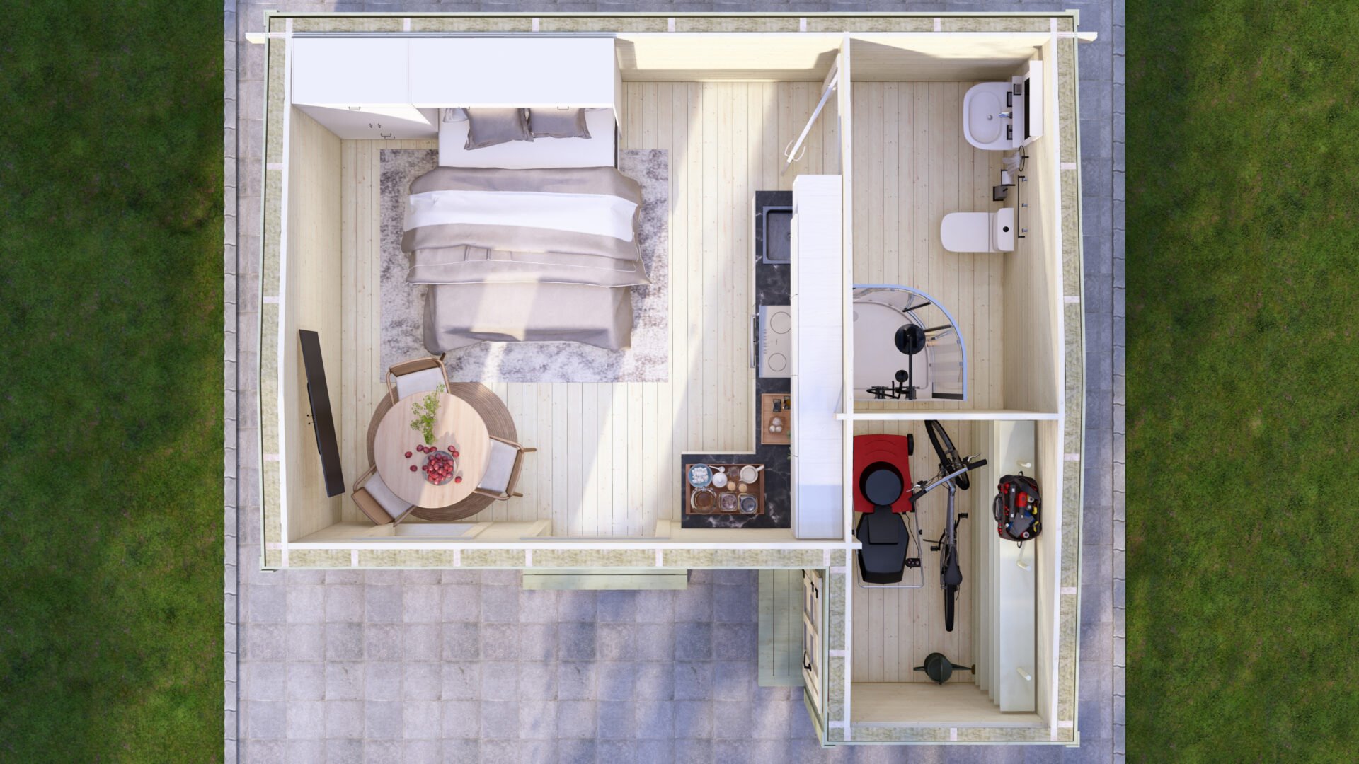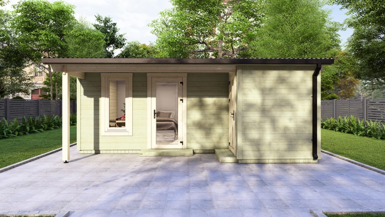 Inside, the cabin retains the same open-plan layout as the Armagh Type A, making it ideal for a Murphy bed or pullout bed. This allows you to maximise space during the day by transforming the sleeping area into a living or working zone. It also includes room for a compact kitchen, a private bathroom, and an outdoor storage room for your convenience.