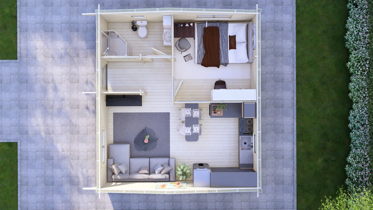 This one-bed B2 log cabin was designed by experts in small-space living, ensuring that every inch of space is utilised to its fullest potential. The clever layout maximises the available area, providing a comfortable and functional living environment. The open-plan setting accommodates a full-sized kitchen, dining area, and living space, creating a bright and airy atmosphere perfect for modern living.
