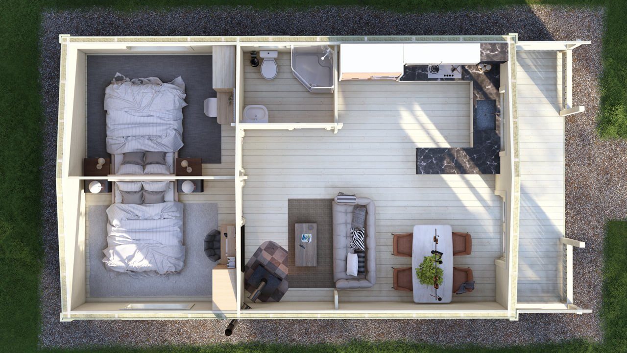 Our most popular 2-bed log cabin/log home model is the 2 bed Type A cabin. This design boasts an open-plan living/kitchen area, providing a spacious and inviting atmosphere for everyday living. Featuring two generously sized double bedrooms, this cabin offers ample space.