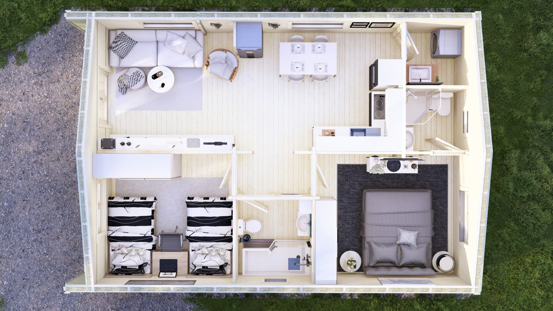 Our two-bed type D cabin, measuring 6.5m x 9.6m, is designed to offer spacious and functional living. The layout features an open-plan living and kitchen area, creating a welcoming atmosphere as soon as you walk in. At the back of the cabin, a convenient storage/utility room provides additional space for organisation and practicality.