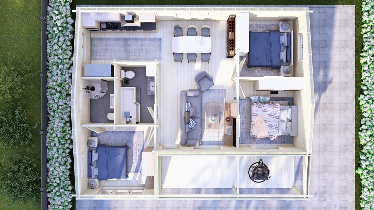 Introducing our new 3-bedroom L-shaped cabin design. Measuring 10.0m x 8.26m, the first feature you will notice is the fabulous front veranda. This cabin is perfect as a family home with its thoughtful layout and spacious rooms, providing ample space for everyone.