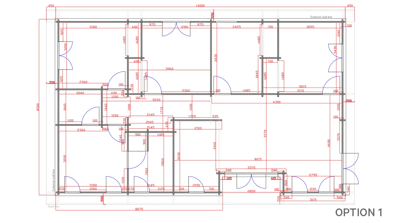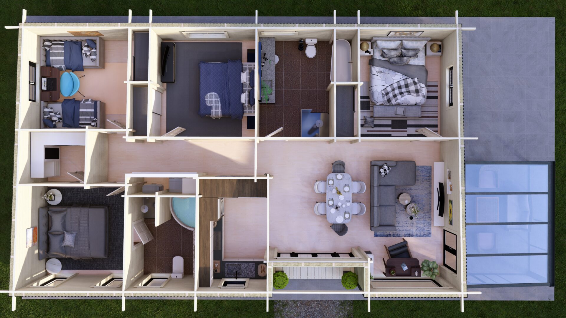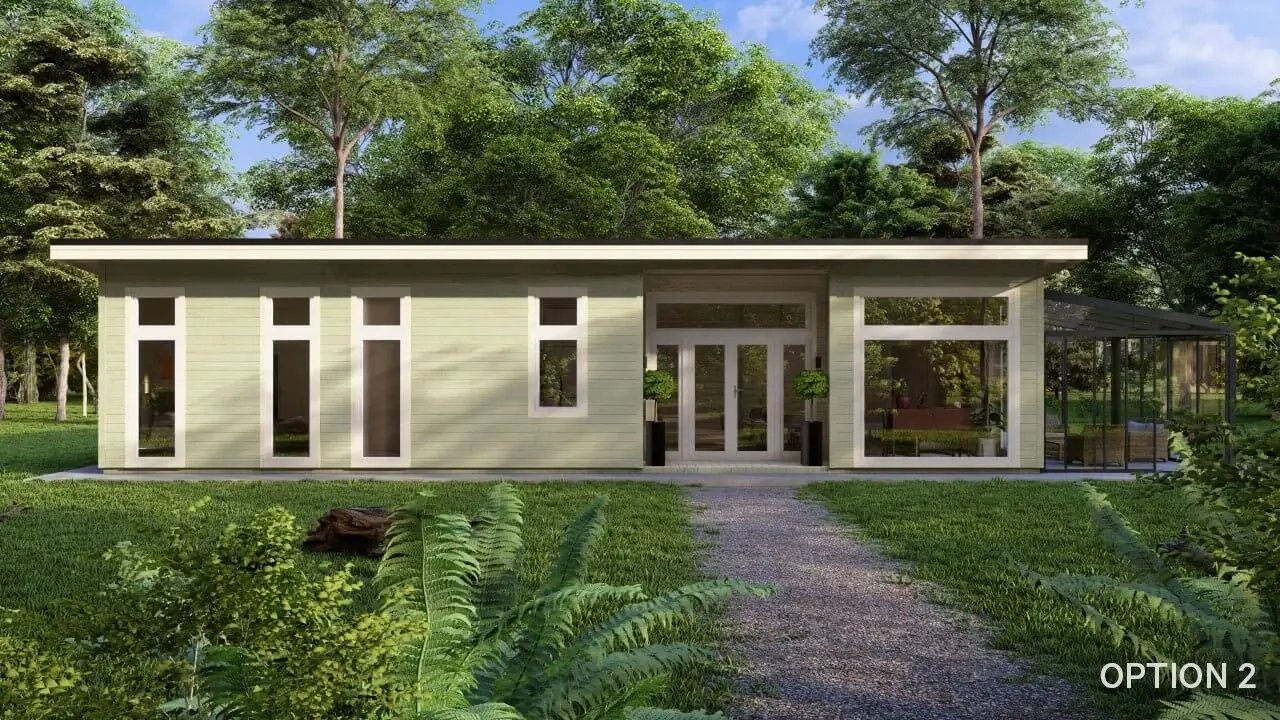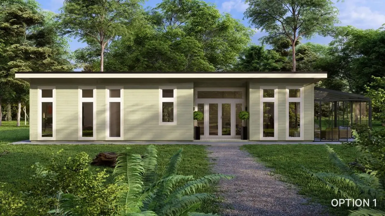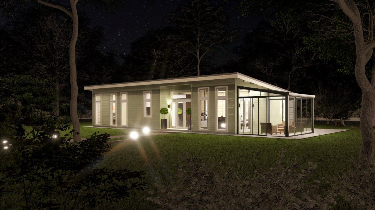 Measuring 14m x 8.5m this model accommodates 4 double bedrooms – The Master bedroom has an ensuite bathroom. The spacious kitchen/living room/dining room area has an incredible vista with full length glass doors and windows optimising light & views. A family bathroom and clever walk in storage closets are sure to suit all your family’s needs.