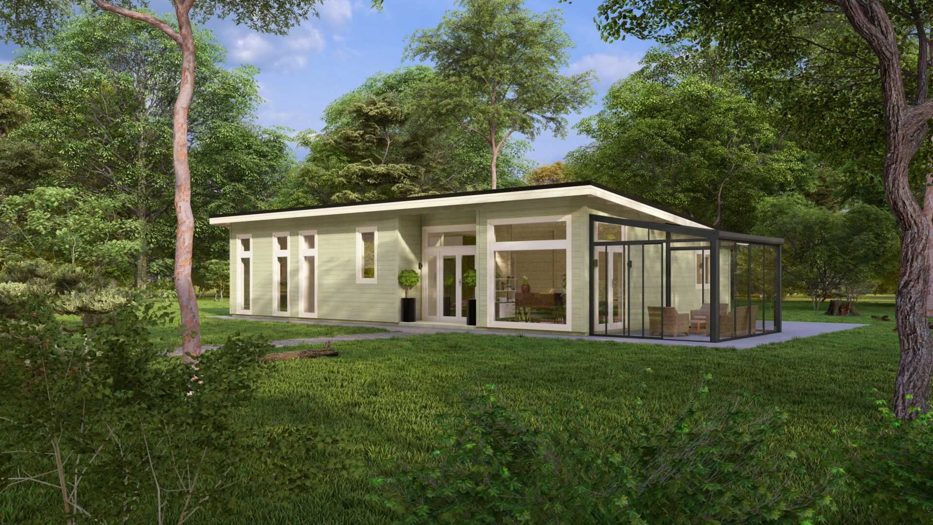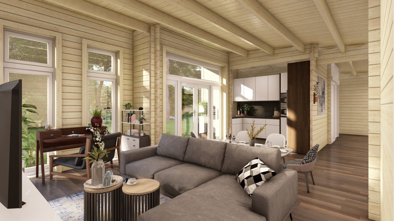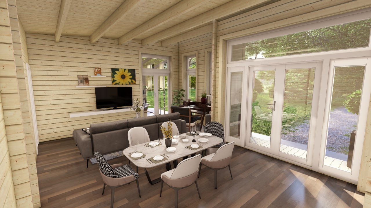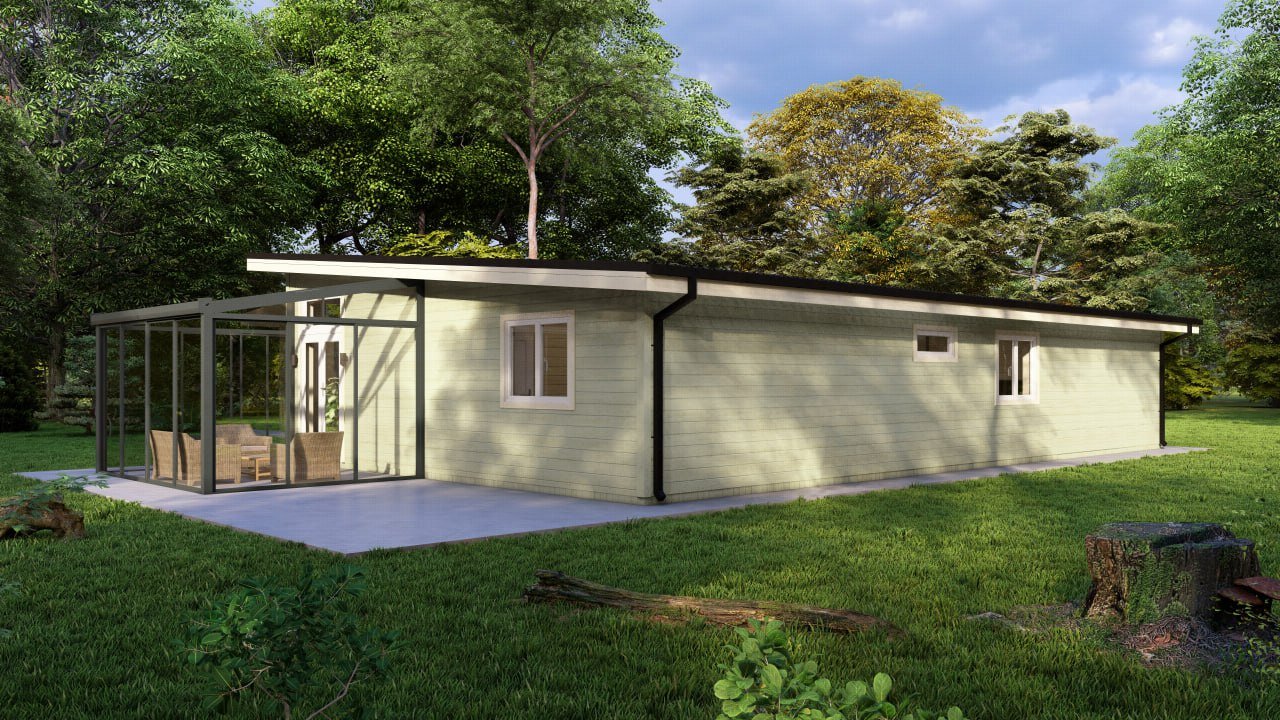 An optional glass veranda (3m x 3m) on the gable end, gives exuberance and a high-quality finish to this superior Log Cabin Home.
